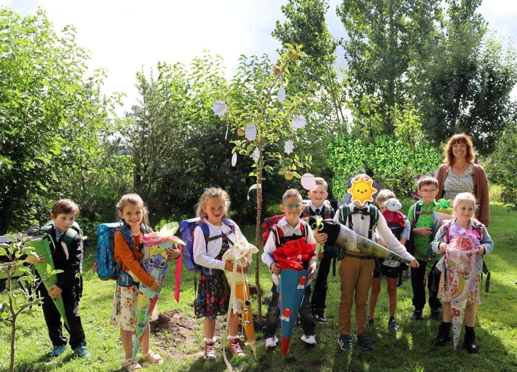 Der Baum wurde eigens für die Klasse auf dem Hof gepflanzt. Die Begeisterung in den Blicken der Kinder und Eltern wird sicher allen noch lange in Erinnerung bleiben.